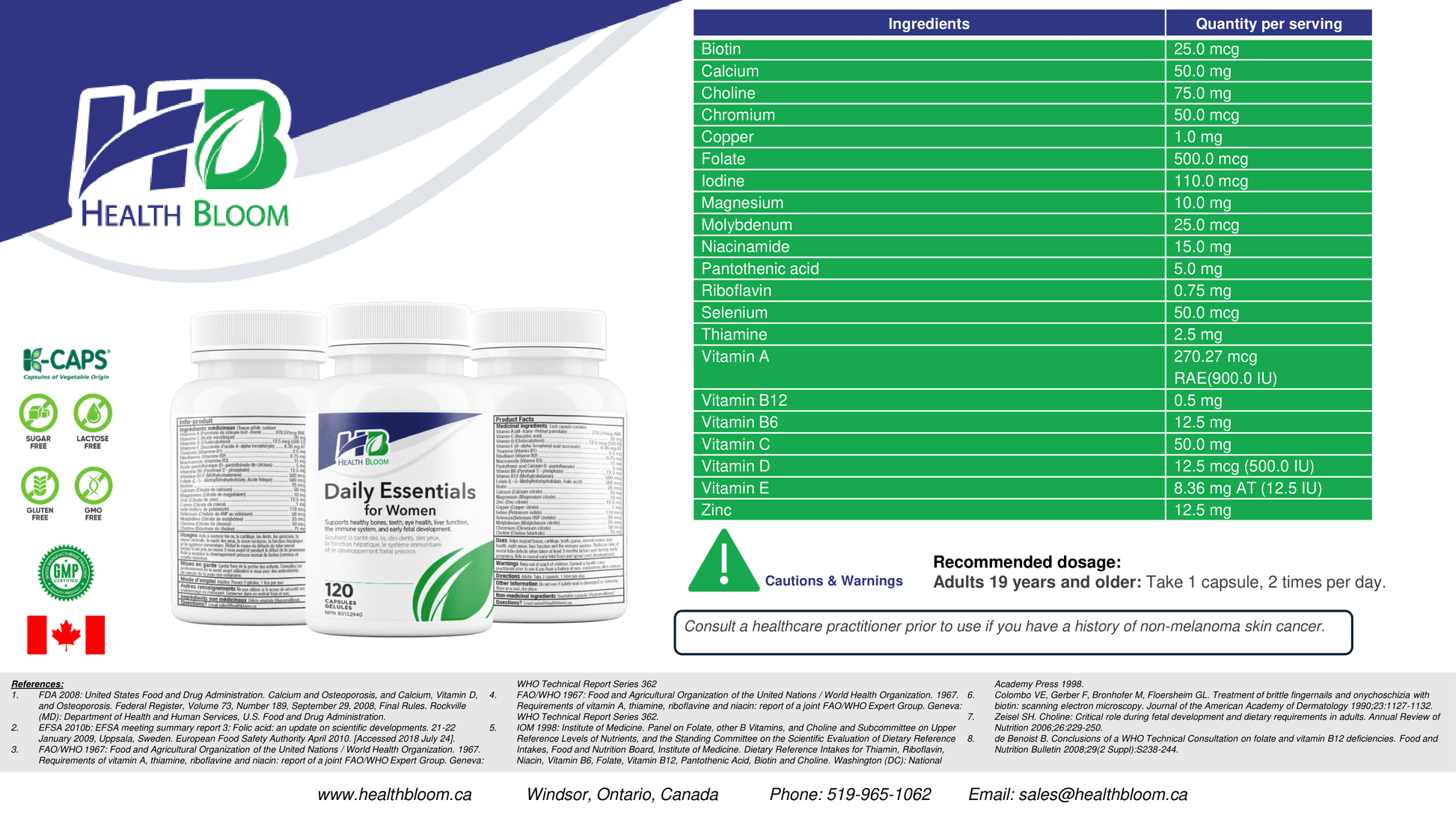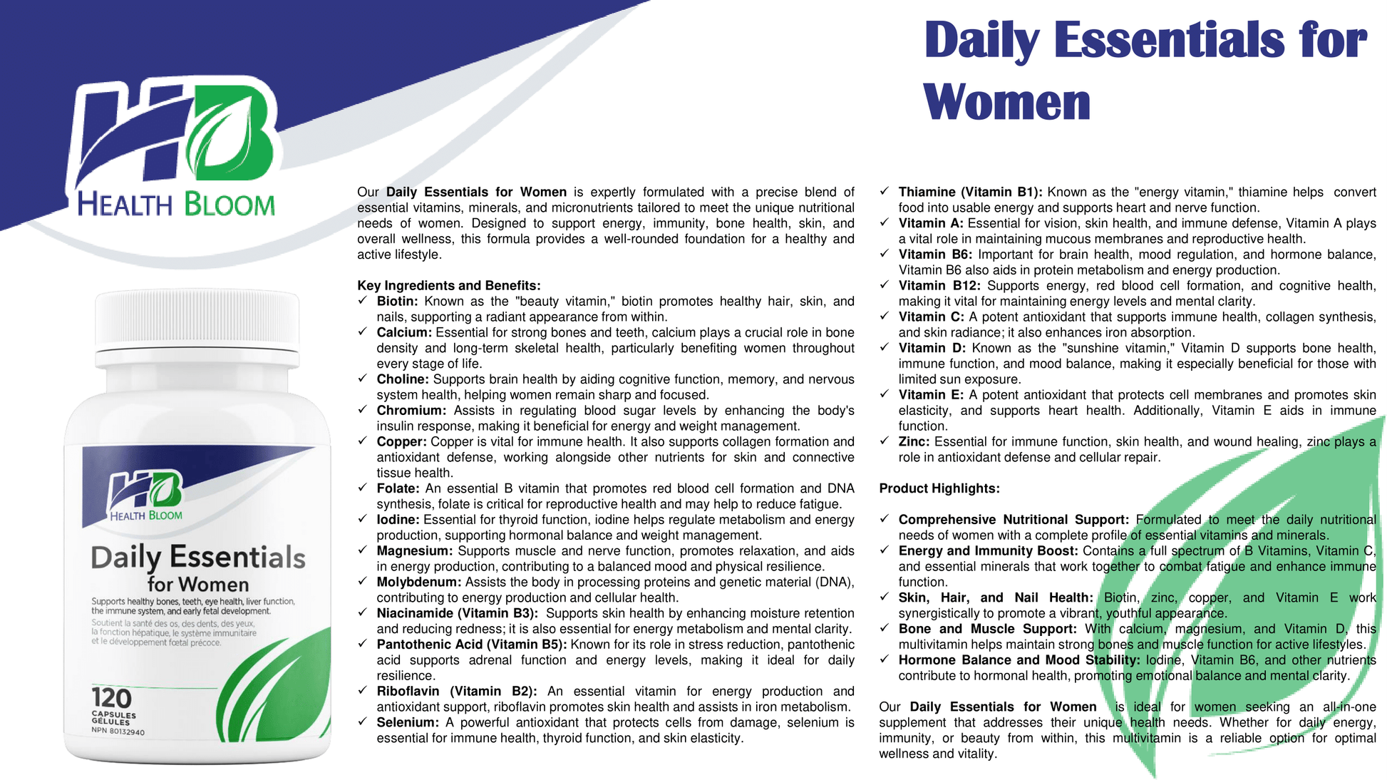 Essential Nutrient Source: Daily Essentials for Women serves as a source of vital vitamins and minerals that support various biological functions. These include Niacinamide, Calcium, Riboflavin, Biotin, Vitamin B12, Molybdenum, Zinc, Folate, Vitamin A, Vitamin D, Vitamin E and Vitamin C. Together, these nutrients play key roles in maintaining overall health and ensuring the body’s systems function optimally.
